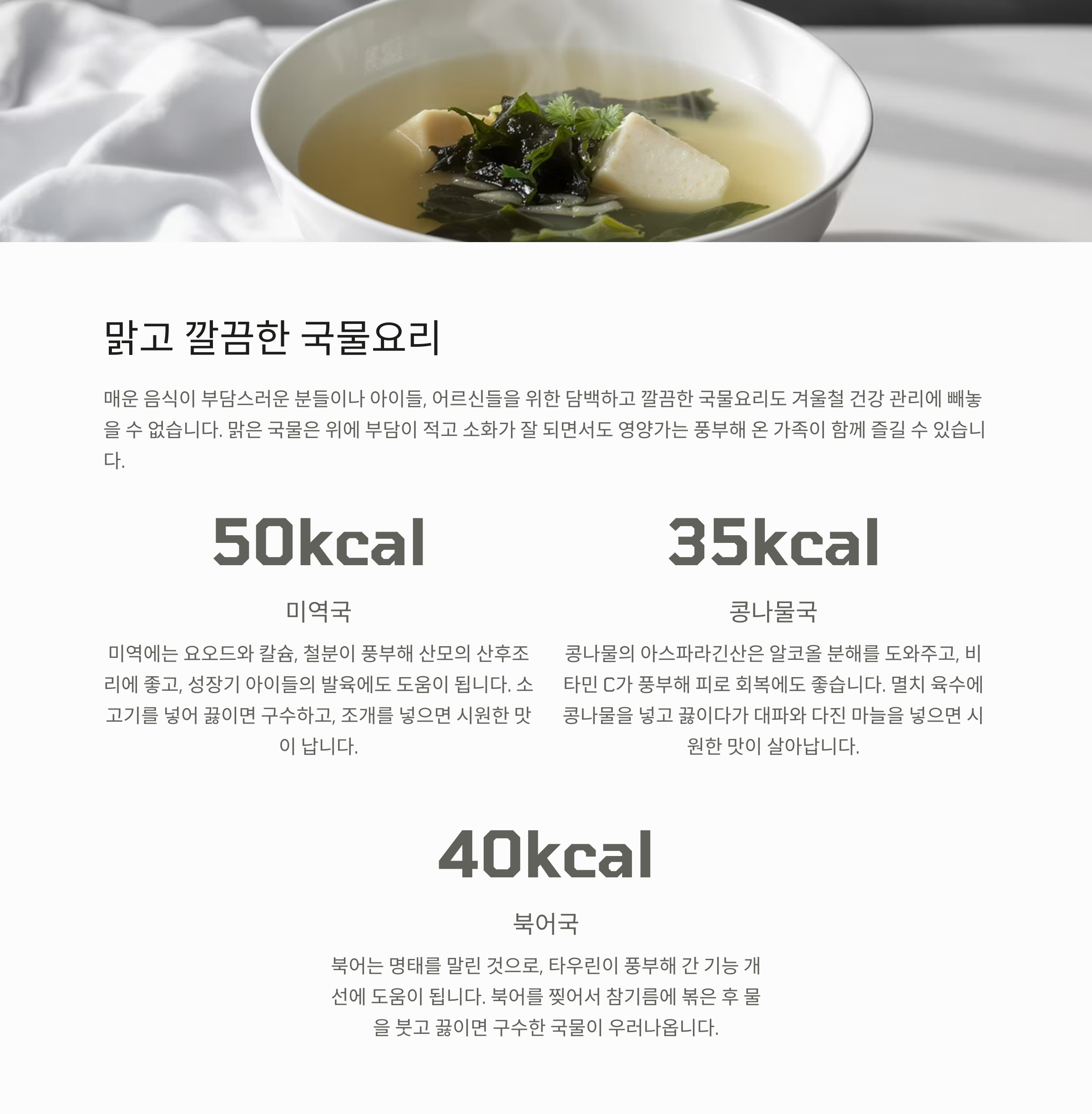 매운 음식이 부담스러운 분들이나 아이들, 어르신들을 위한 담백하고 깔끔한 국물요리도 겨울철 건강 관리에 빼놓을 수 없어요. 맑은 국물은 위에 부담이 적고 소화가 잘 되면서도 영양가는 풍부해 온 가족이 함께 즐길 수 있답니다. 미역국, 콩나물국, 북어국 등 우리 밥상의 기본이 되는 맑은 국물요리들의 깊은 맛을 함께 알아볼까요? 🍜