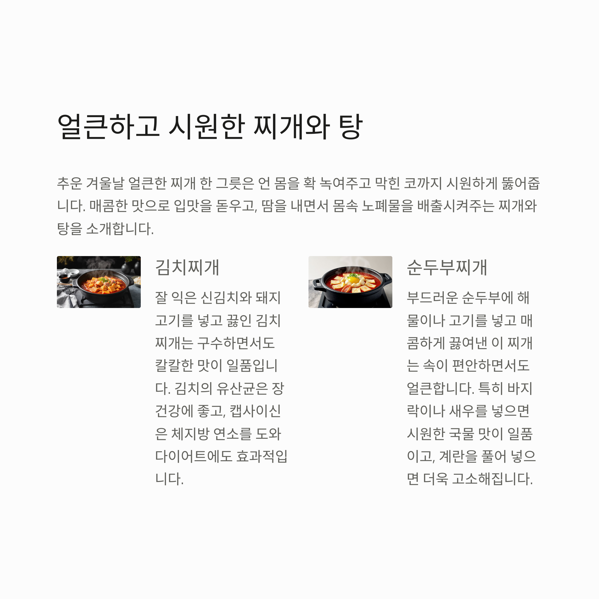 추운 겨울날 얼큰한 찌개 한 그릇은 언 몸을 확 녹여주고 막힌 코까지 시원하게 뚫어주죠. 한국인의 밥상에서 빠질 수 없는 찌개와 탕은 매콤한 맛으로 입맛을 돋우고, 땀을 내면서 몸속 노폐물을 배출시켜줘요. 김치찌개부터 순두부찌개, 부대찌개까지 다양한 얼큰한 국물요리들의 매력에 빠져보실까요? 이런 매운 국물요리들은 스트레스 해소에도 효과적이랍니다 🔥