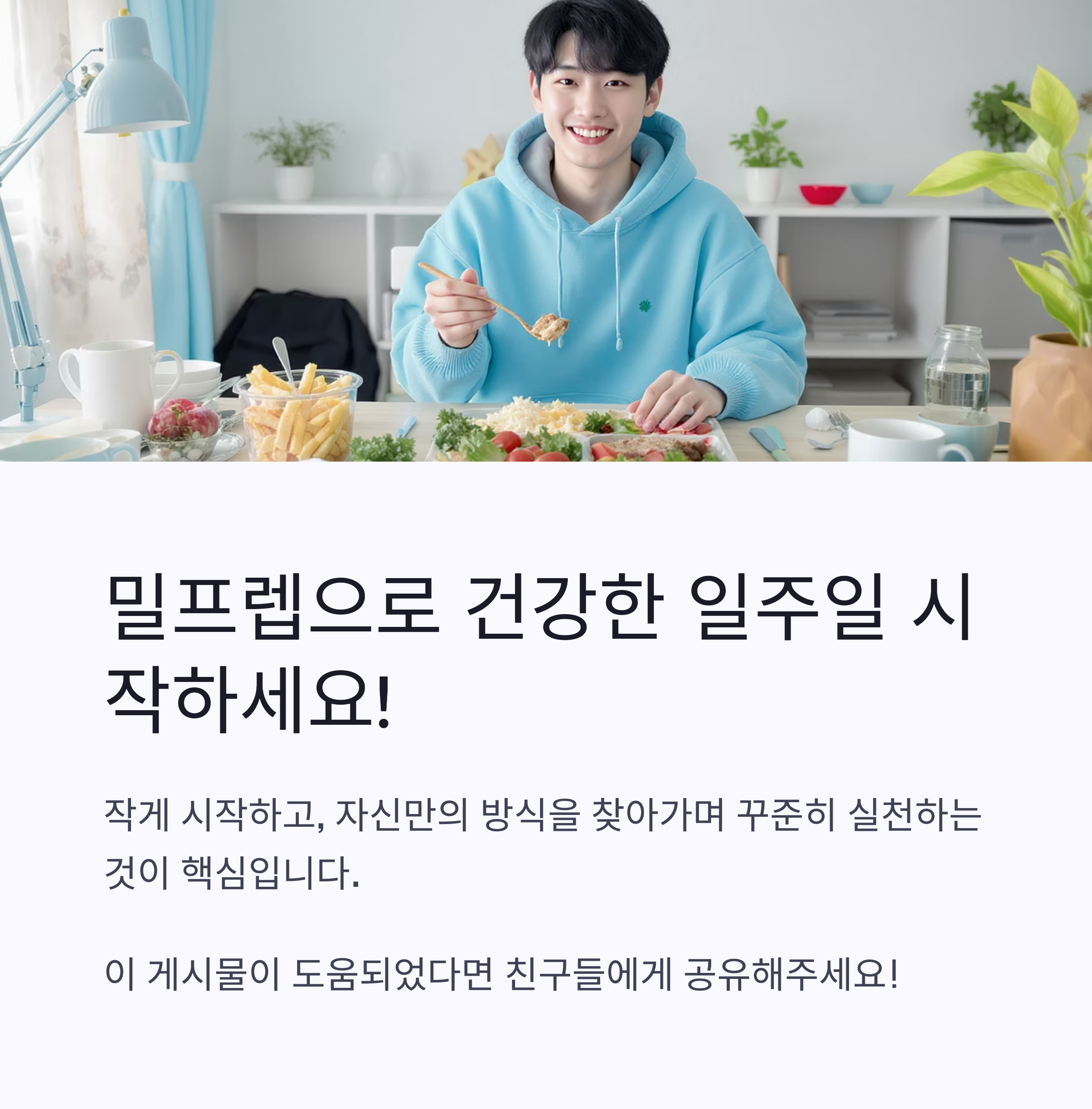 내가 생각했을 때 밀프렙 성공의 핵심은 자신의 라이프스타일에 맞는 방법을 찾는 거예요. 모든 음식을 완전히 조리해서 보관하는 방법도 있고, 재료만 손질해두고 조리는 그때그때 하는 방법도 있어요. 자신에게 맞는 방식을 찾아가면서 점차 발전시켜 나가는 것이 중요해요.