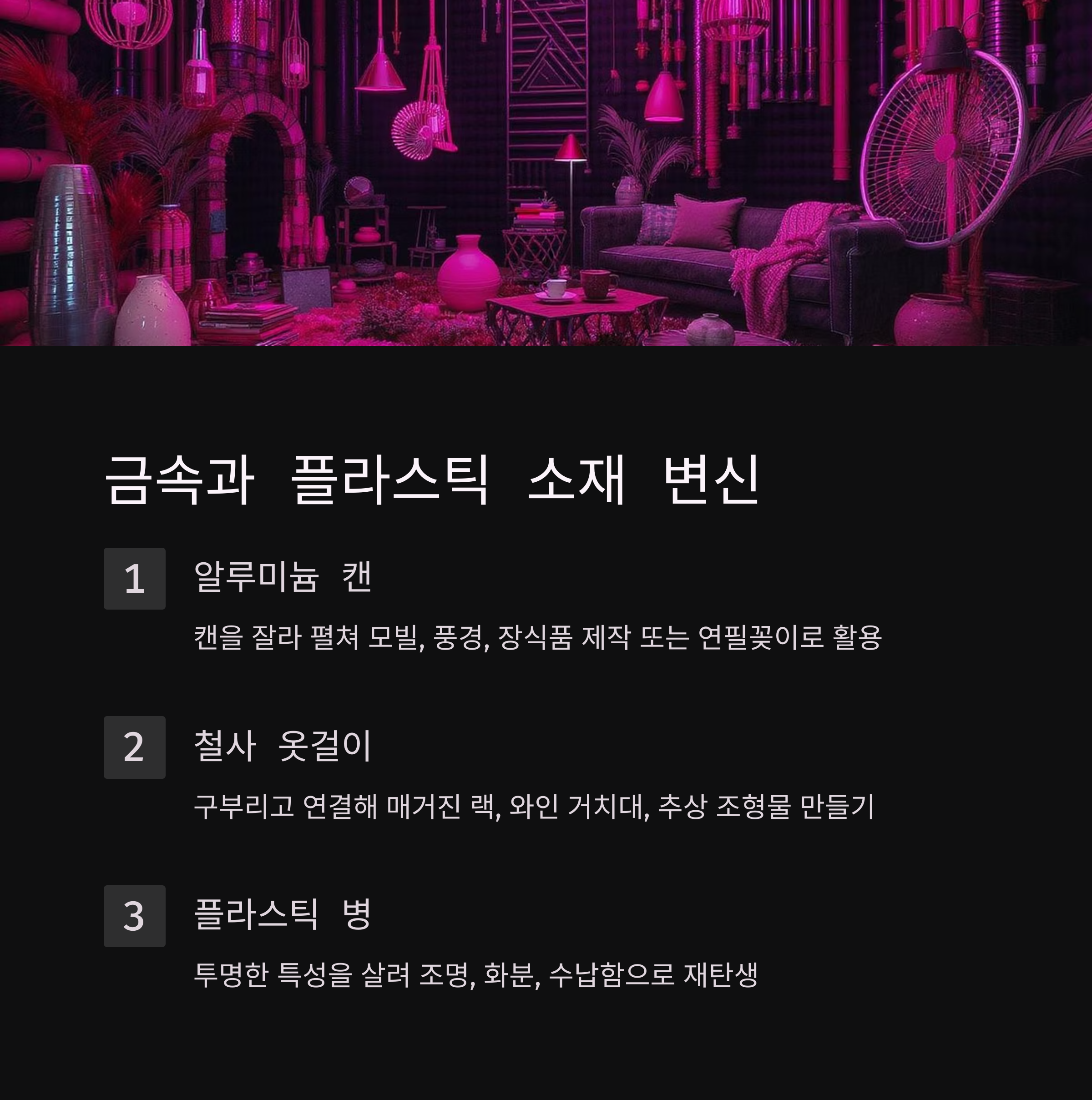 금속과 플라스틱은 내구성이 뛰어나고 다양한 형태로 가공할 수 있어서 업사이클링에 매우 적합한 재료예요. 캔, 철사, 플라스틱 병, 용기 등 일상에서 쉽게 구할 수 있는 재료들이 세련된 인테리어 소품으로 재탄생할 수 있답니다. 특히 현대적이고 미니멀한 인테리어 스타일을 선호하는 사람들에게 금속과 플라스틱 업사이클링은 완벽한 선택이 될 수 있어요 🔩