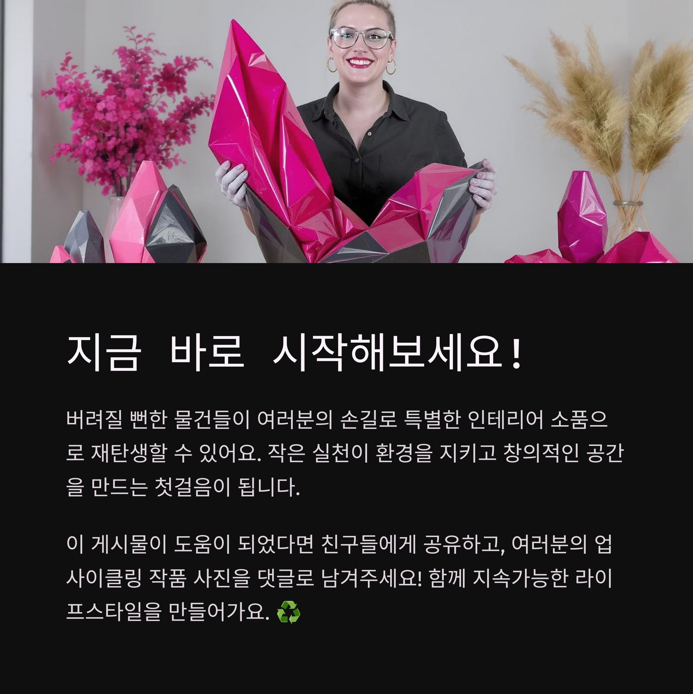 업사이클링 인테리어의 가장 큰 매력은 세상에 단 하나뿐인 작품을 만들 수 있다는 점이에요. 똑같은 재료를 사용하더라도 만드는 사람의 감성과 아이디어에 따라 전혀 다른 결과물이 나오게 되죠. 내가 생각했을 때 이런 독창성이야말로 업사이클링의 진정한 가치라고 할 수 있어요. 기성품에서는 찾을 수 없는 나만의 개성을 표현할 수 있는 최고의 방법이랍니다