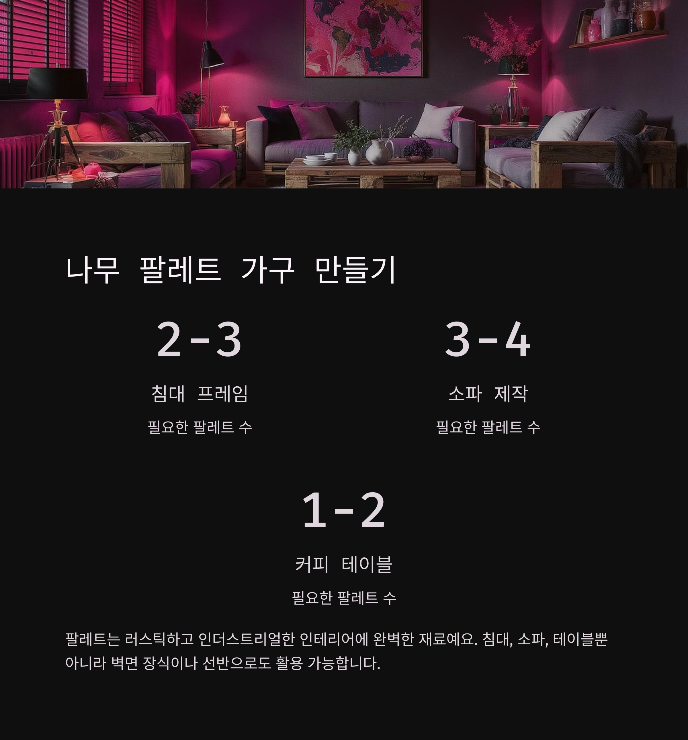 팔레트 가구의 가장 큰 매력은 모듈식으로 조합이 가능하다는 점이에요. 필요에 따라 추가하거나 빼면서 크기와 형태를 조절할 수 있어서, 이사를 가거나 공간이 바뀌어도 유연하게 대응할 수 있어요. 또한 팔레트 특유의 인더스트리얼한 느낌은 현대적인 인테리어와도 잘 어울리고, 식물이나 패브릭과 조합하면 부드러운 분위기도 연출할 수 있답니다 🛠️