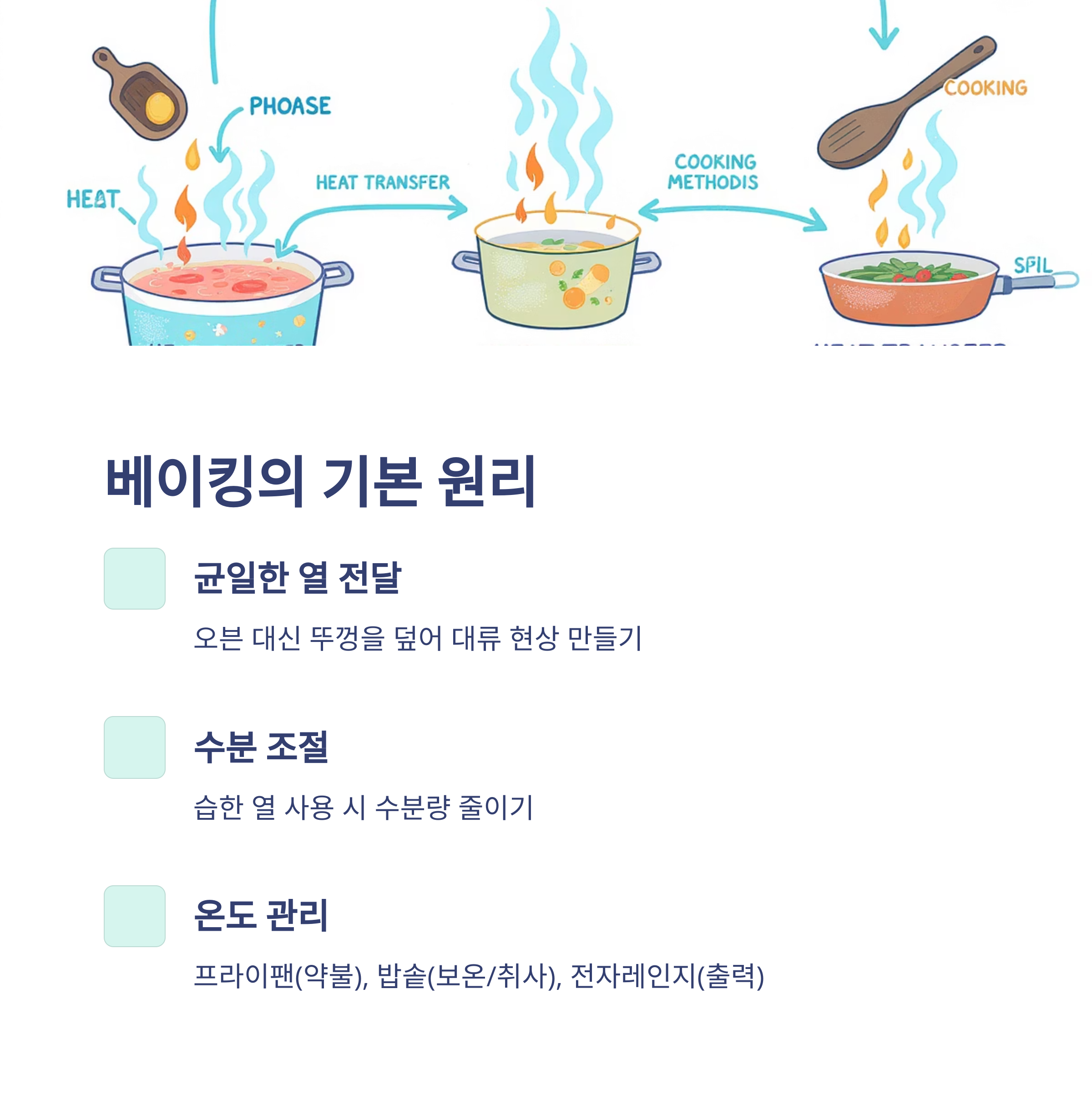 베이킹의 핵심은 '균일한 열 전달'이에요. 오븐은 사방에서 열이 전달되지만, 다른 도구들은 아래에서만 열이 올라와요. 이를 보완하기 위해 뚜껑을 덮어 대류 현상을 만들거나, 중탕법을 사용해 부드러운 열을 전달하는 거예요.