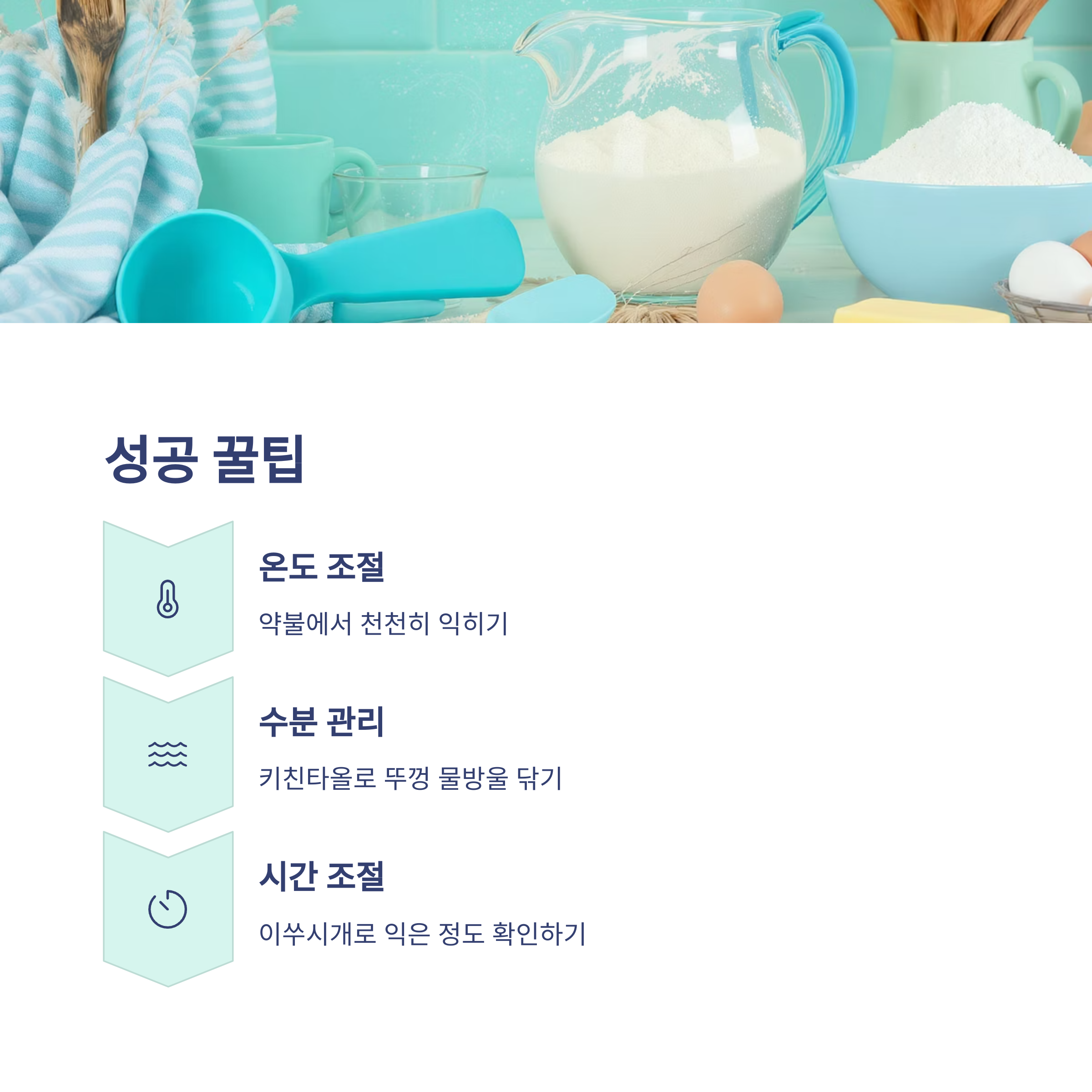 | 반죽 준비 | 과하게 섞지 않기 | 10분 | 재료 온도 맞추기 |