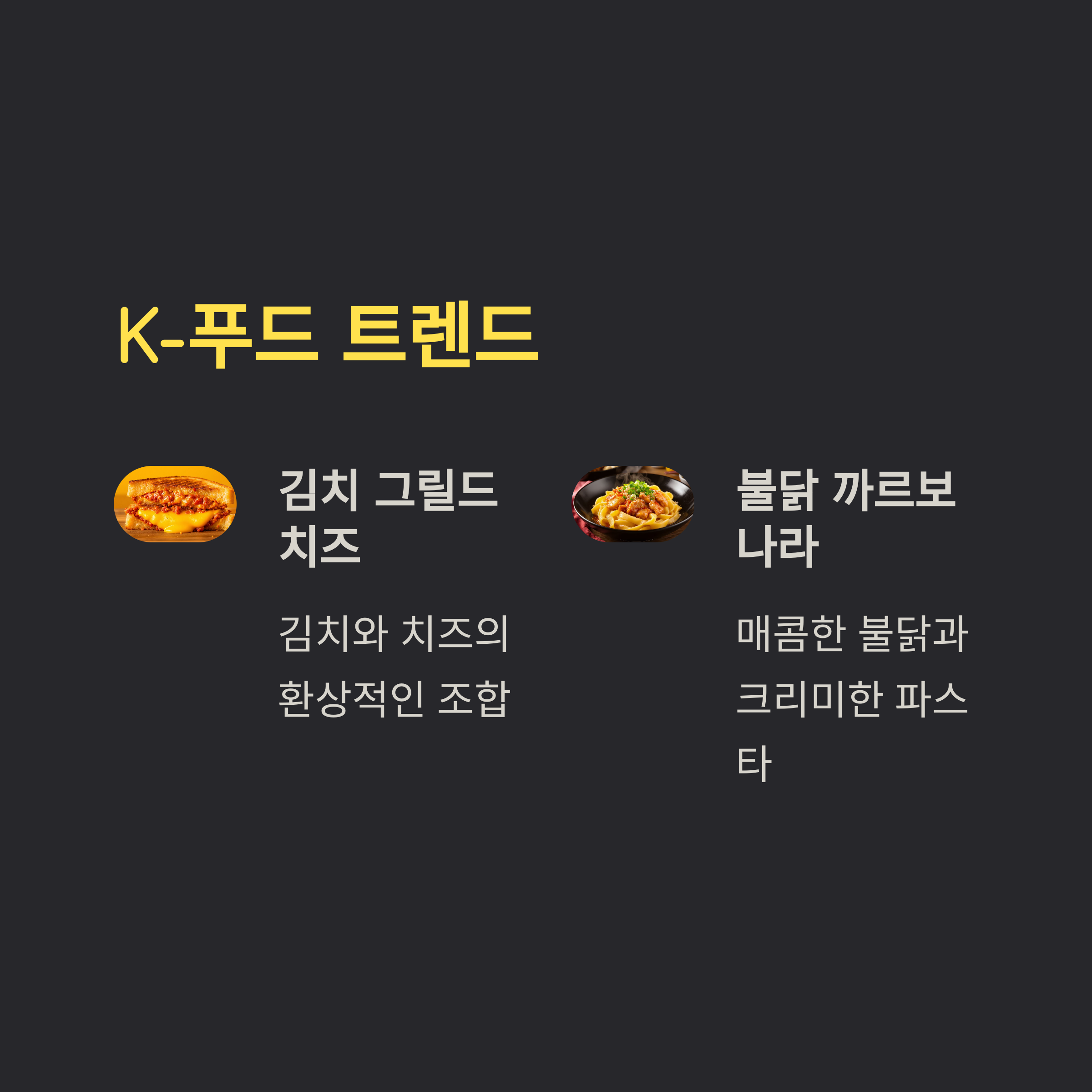 | 퓨전 & 크로스오버 | 김치 파스타, 불닭 피자 |
